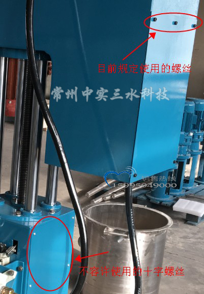 今天何總在車間里抽檢一臺準備出廠的升降式攪拌機時發火了,起因就是為了這臺攪拌機安裝面板上用了幾顆不符合出廠要求的螺絲釘(下圖中標注的十字螺絲現在規定都應換成內六角螺絲)。